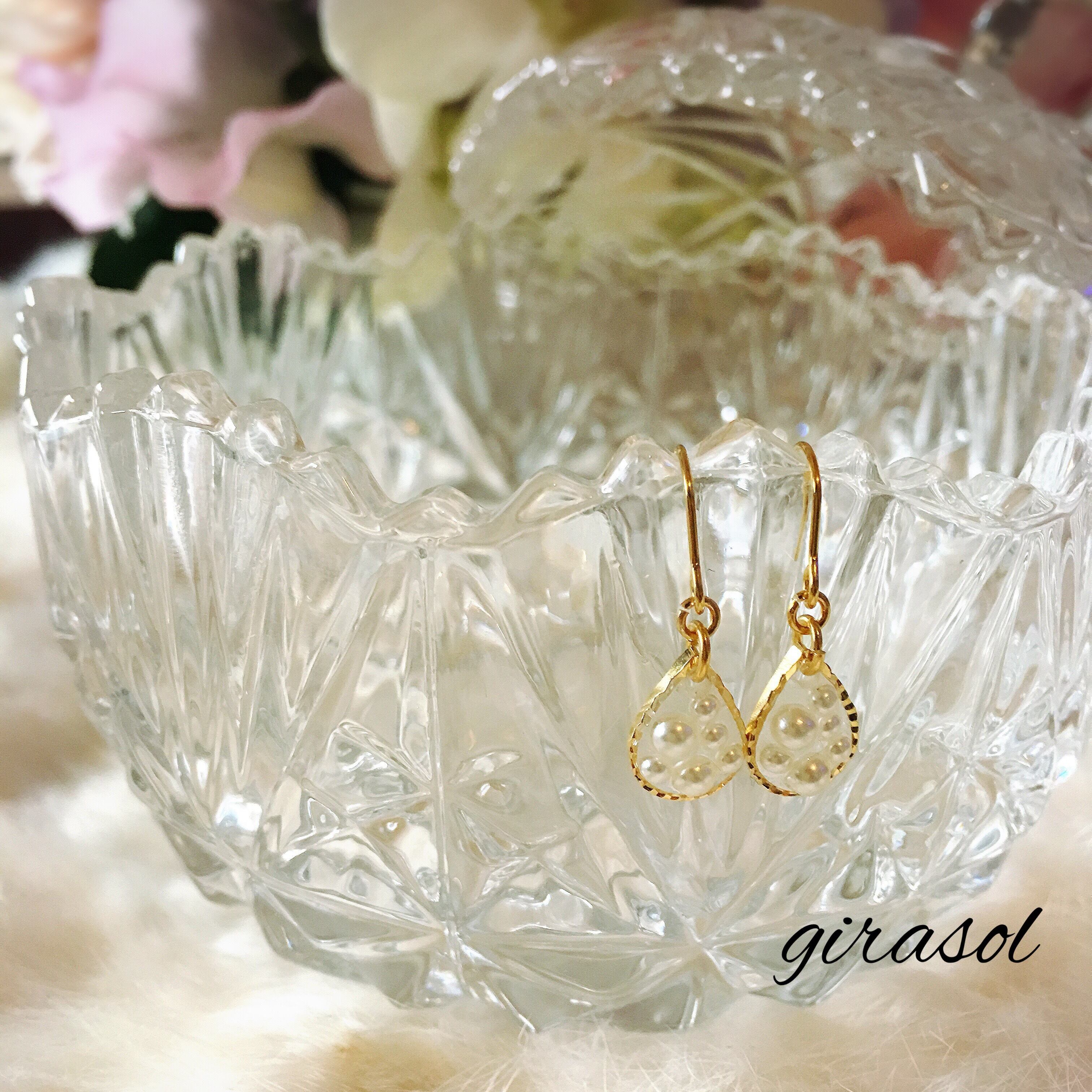雫のメタルパーツの中に2種類の大きさのちっちゃなパールを埋め込みました。