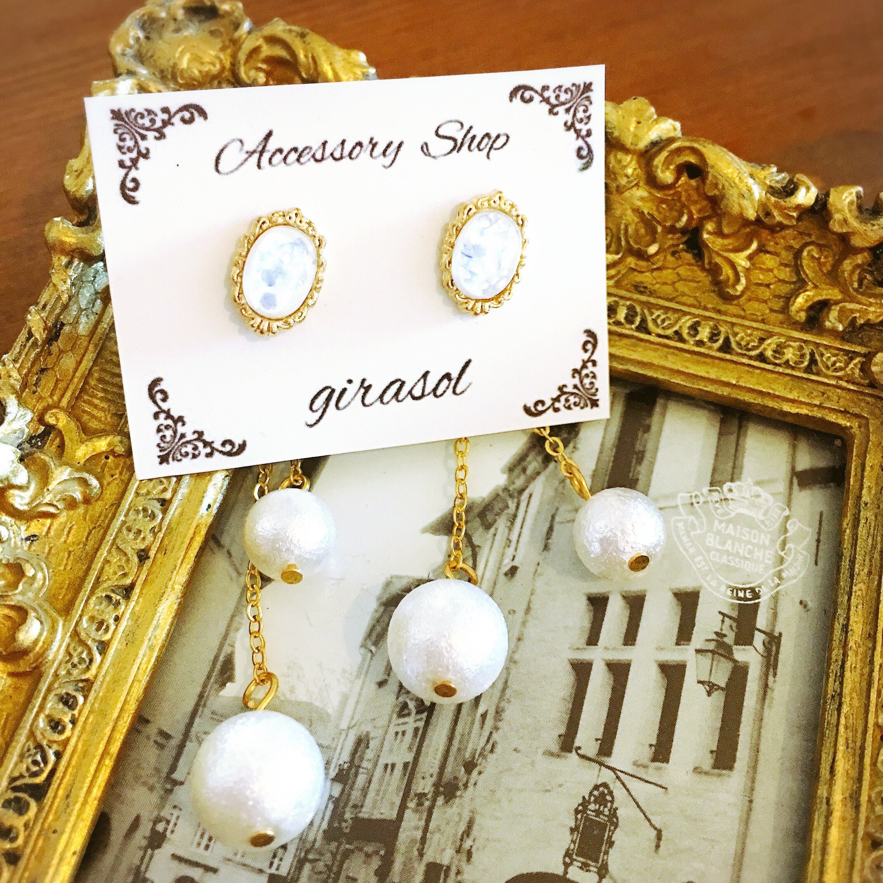 2種類の大きさのコットンパールを後ろから出るようにした、チェーンが揺れるピアスです!