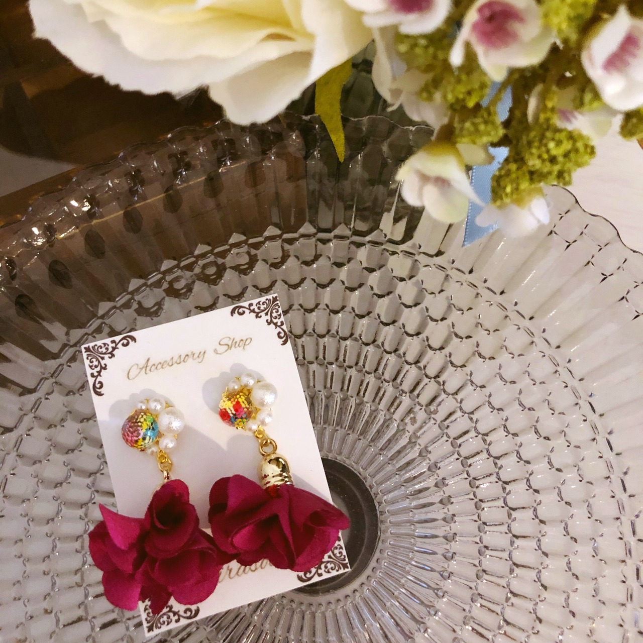 レインボービーズとパールをカボションに、ピンクのフラワータッセルをつなげました!