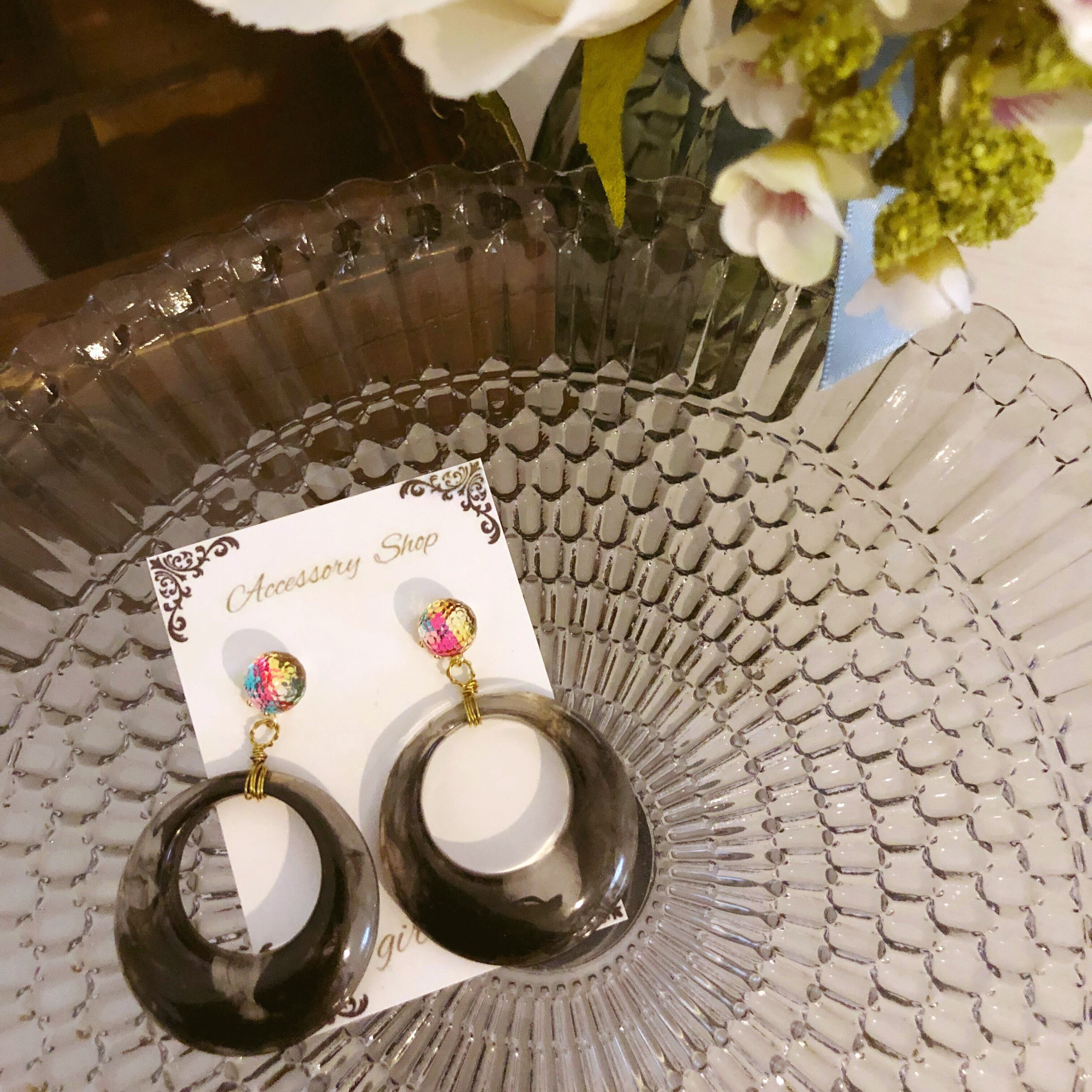 レインボー、ブラックのリングピアス